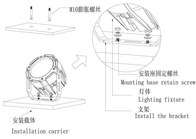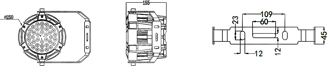 | 燈體材質(zhì): 壓鑄鋁+鋼化玻璃+沖壓支架+高效光學級透鏡 | 燈體尺寸: Φ250*155mm (可加遮光罩) | ||