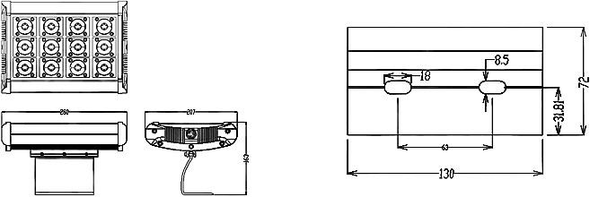| 燈體材質(zhì): 壓鑄鋁+鋼化玻璃+沖壓支架+高效光學(xué)級(jí)透鏡 | 燈體尺寸: 207*280*163mm |