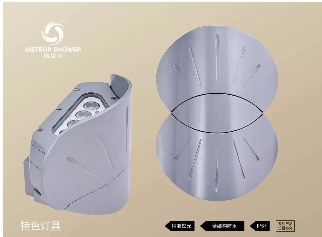 流星宇全新研發(fā)新款【珍珠貝壁燈】,外形設(shè)計(jì)來源于深海扇貝,其上下對(duì)稱的貝殼形態(tài)既實(shí)現(xiàn)了遮光罩的防眩光目的,又能很好地將功能化的照明產(chǎn)品融入建筑外墻,是自然形態(tài)與人工物的良好結(jié)合。壁燈采用全結(jié)構(gòu)防水無膠工藝,防護(hù)等級(jí)IP67,廣泛應(yīng)用于建筑物或立柱等戶外景觀照明。