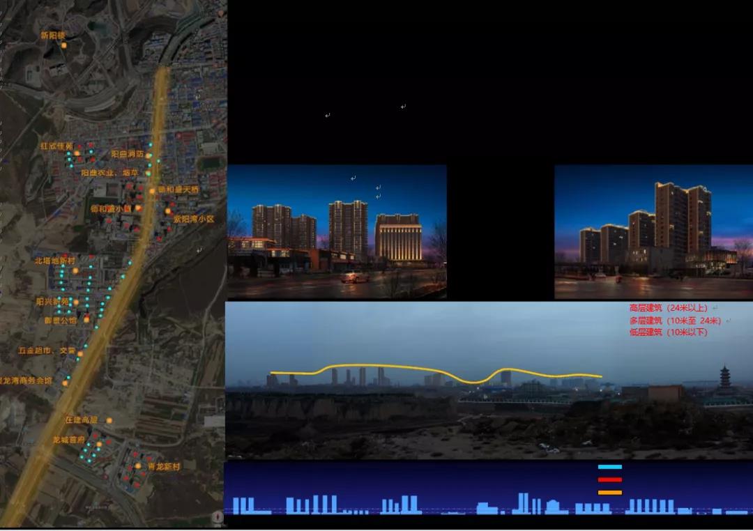 設(shè)計(jì)范圍內(nèi)建筑以高層住宅為主,沿街部分以商業(yè)及行政辦公類矮層建筑居多,照明以突出建筑頂部和立面線條為出發(fā)點(diǎn),意在勾勒出夜晚城市的天際輪廓線,展現(xiàn)城市夜晚魅力及發(fā)展特色,拉動(dòng)夜間經(jīng)濟(jì)。