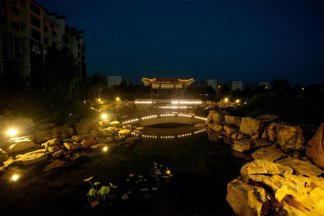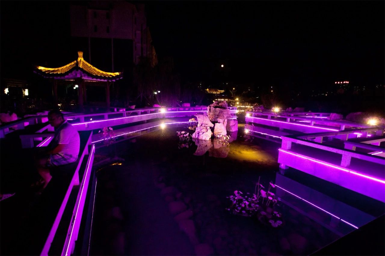 碧波蕩漾的湖水被種類繁多的植物包圍,兩旁綠植迎風搖曳,舒展開無限詩情畫意,一輪新月高高地懸掛在空中,走在小橋上,沐浴柔和的月光,兩岸燈光繁星點點,俯瞰全景,別有一番滋味在心頭,山水莊園燈光讓人感受到與眾不同的恢宏氣勢。