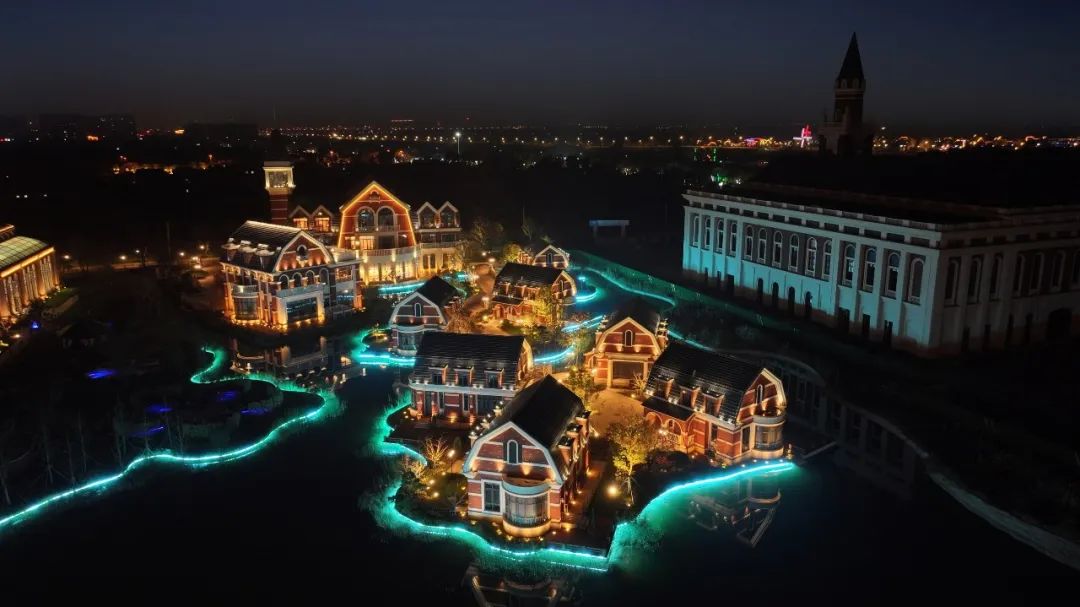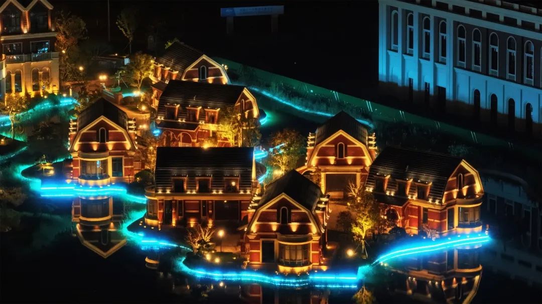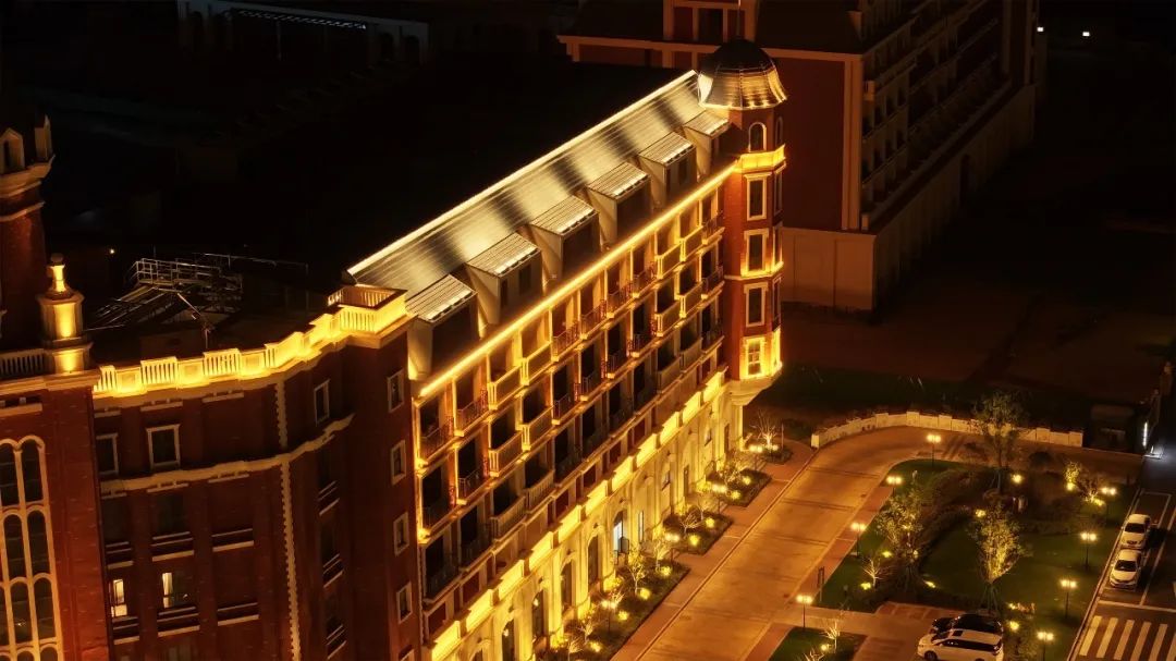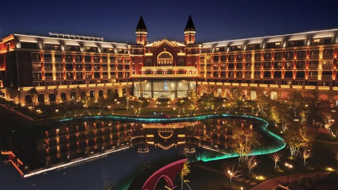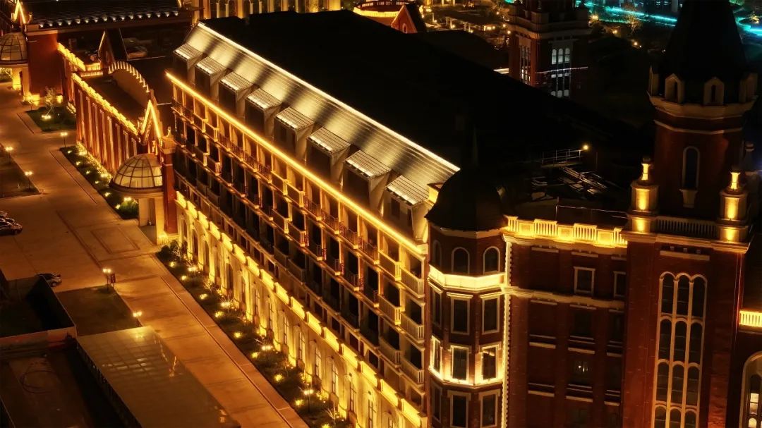 天沐溫泉度假酒店整體外觀宏偉而壯觀,夜景照明與現(xiàn)代化審美相結(jié)合,創(chuàng)造出了新的藝術(shù)美感,仿佛身處于荷蘭城堡。