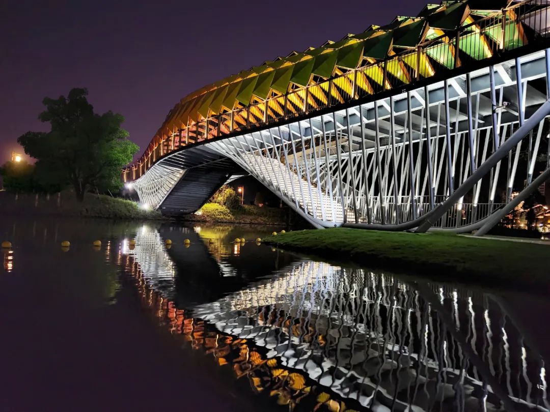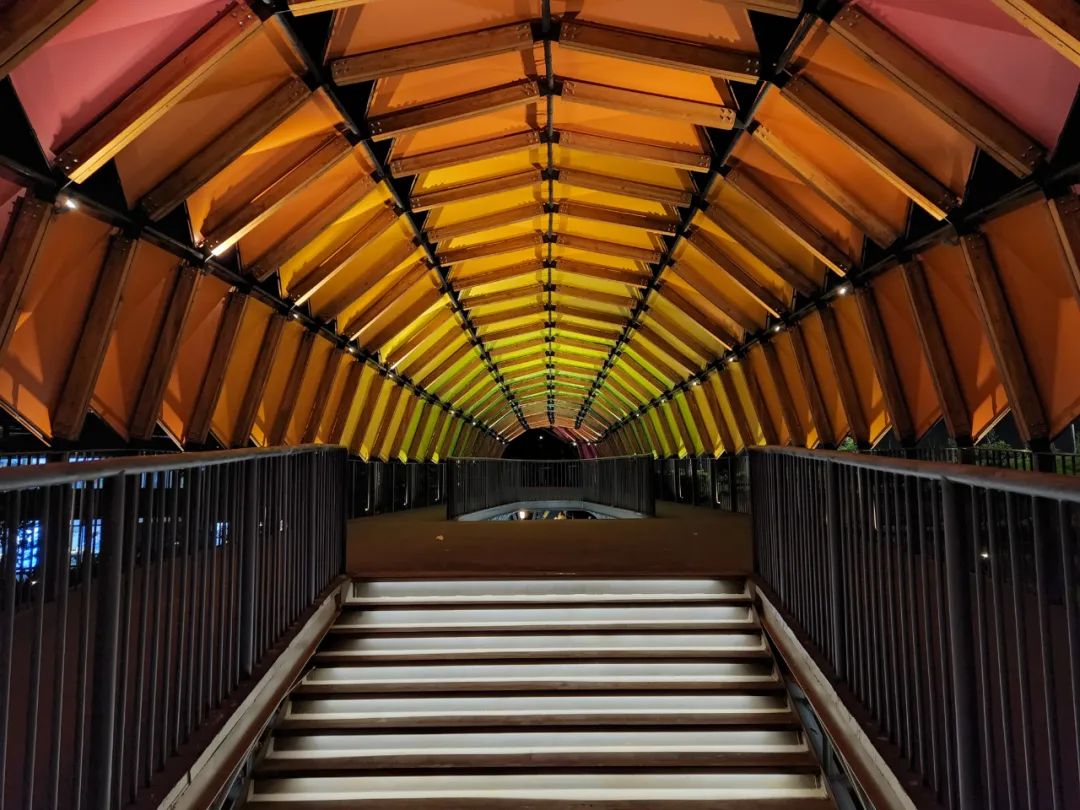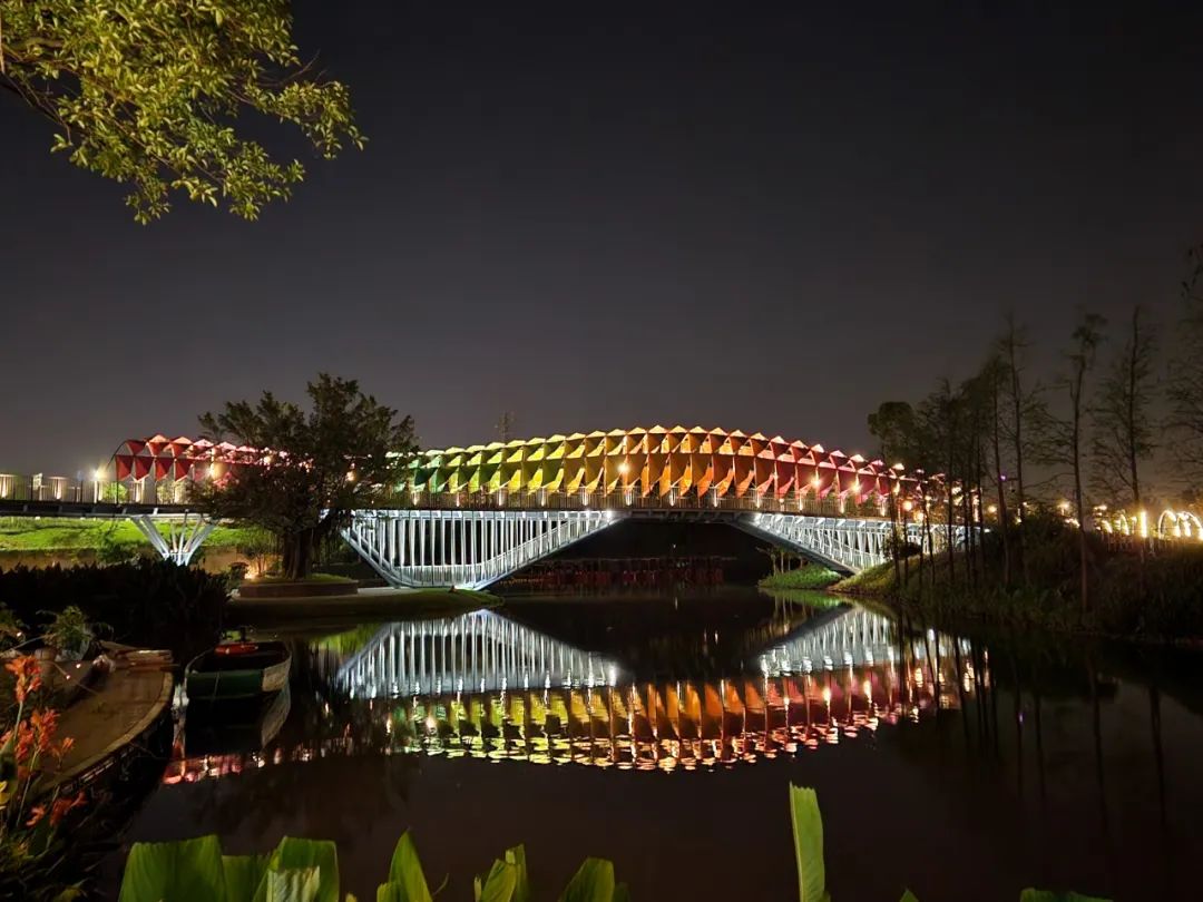 每當(dāng)夜幕降臨,分布于雙鷺橋內(nèi)的各組燈具,也隨之亮起璀璨光彩。順暢的光效沿著橋內(nèi)的不同結(jié)構(gòu)流動(dòng),使得橋更具別一樣的美。