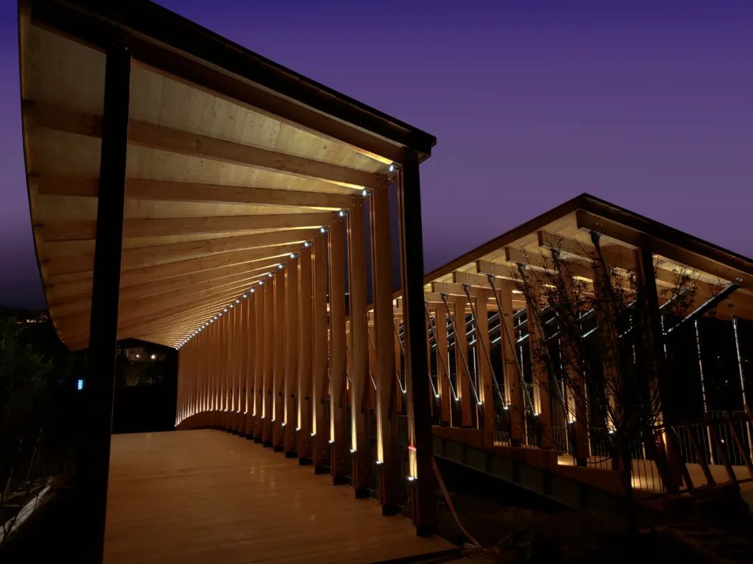 童夢橋遵循了傳統(tǒng)木橋架設(shè)廊屋的建造智慧,通過廊的建造在結(jié)構(gòu)上達(dá)到整體穩(wěn)定性,同時(shí)也保護(hù)下面的拱木結(jié)構(gòu)避免日曬雨淋。