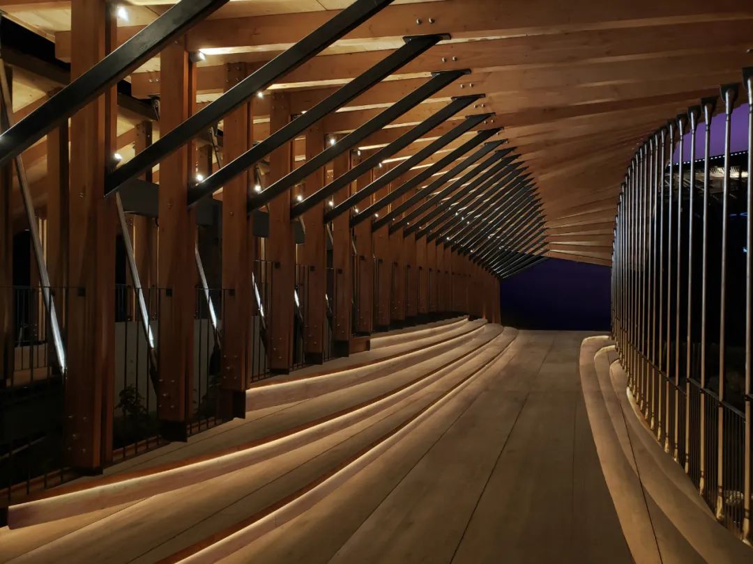 小截面的次結(jié)構(gòu)體系,不僅使得廊空間內(nèi)部有很好的結(jié)構(gòu)構(gòu)造感,也讓穿行在橋底的游船乘客于橋下觀看橋底也頗有建造匠藝細(xì)節(jié)的視覺體驗(yàn)。