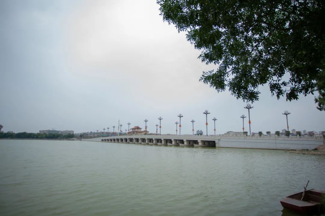 開(kāi)封市最大的仿古景觀橋梁-迎賓橋位于開(kāi)封城內(nèi)迎賓路段中段,南北方向橫跨包公湖,橋長(zhǎng)192.8米,引橋長(zhǎng)187.2米。迎賓橋由主橋和引橋兩部分組成,其中主橋?yàn)?7跨簡(jiǎn)支梁雙幅橋,長(zhǎng)192.8米。迎賓橋是開(kāi)封市政、交通項(xiàng)目重點(diǎn)工程、重大基礎(chǔ)設(shè)施工程和重要路網(wǎng)融合工程。橋?qū)?0米,雙向四車(chē)道,同步建有慢車(chē)道和人行道。