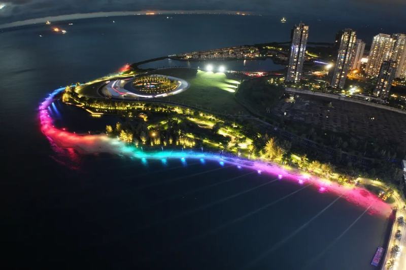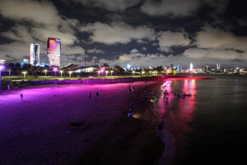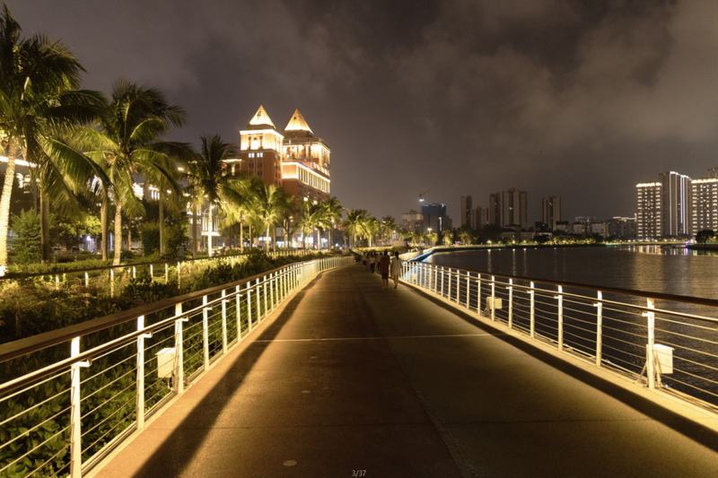 沿著步行道來一場海邊漫步,海風(fēng)輕撫,送來陣陣清涼白日的燥熱已然消散,微波蕩漾,倒映流光迷人的燈光匯聚成璀璨絢麗的夜景。