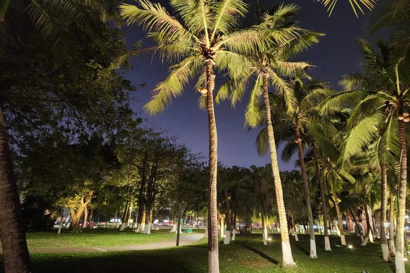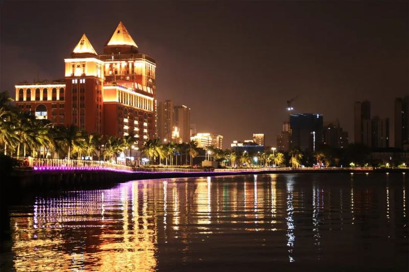 濱海大道沿線的樓宇、人民橋、和平橋、云洞圖書館、保利中央海岸、天空之山等燈光交匯,燈光串起璀璨夜景光彩奪目,如同點(diǎn)點(diǎn)繁星,將夜色裝點(diǎn)得分外妖嬈。漫步在??诘慕诸^,兩旁的椰樹在夜風(fēng)中輕輕搖曳,仿佛是大自然的守護(hù)者,靜靜地訴說著這座城市的熱帶風(fēng)情。